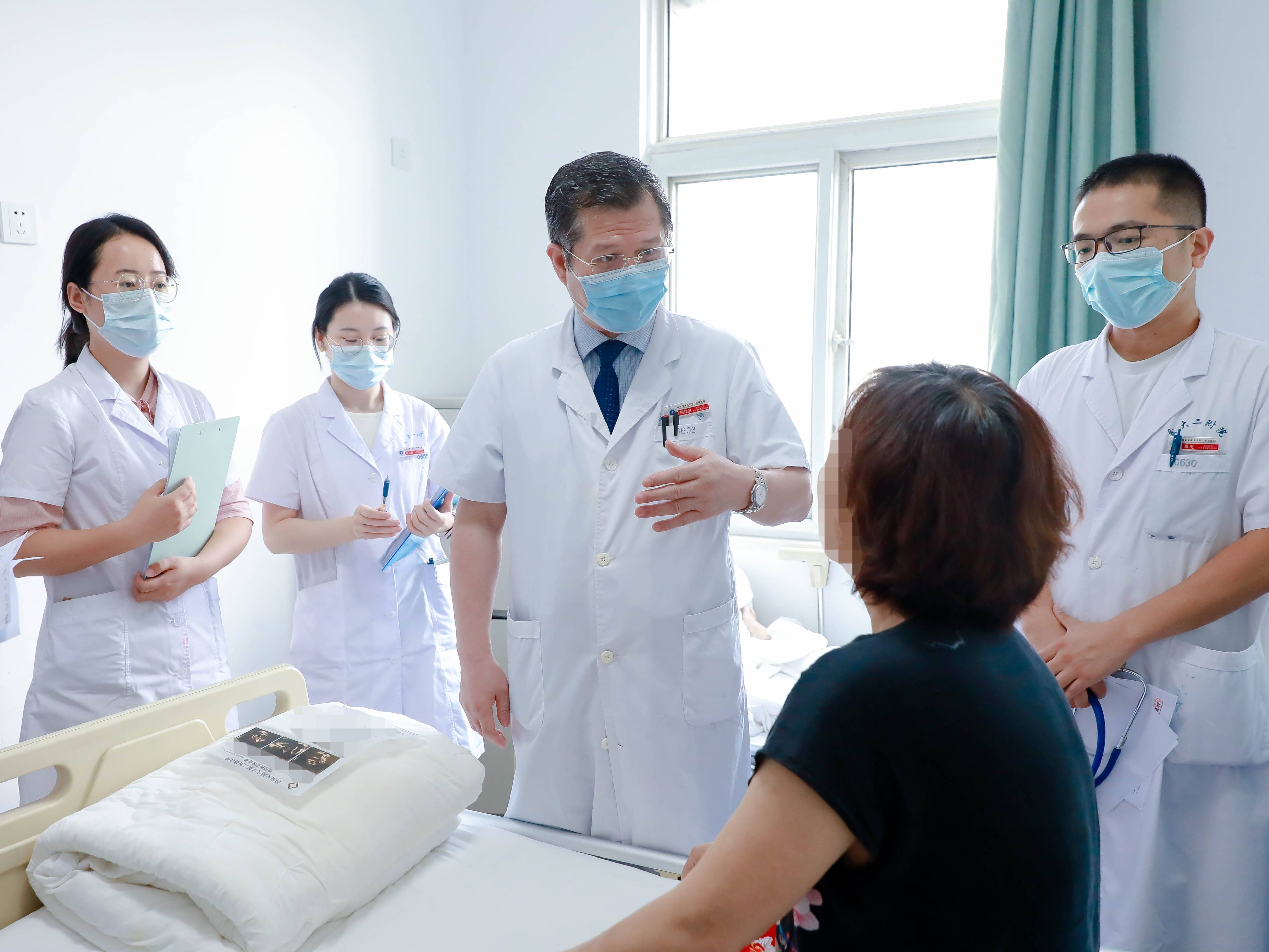西安交通大学第二附属医院呼吸与危重症医学科主任医师杨拴盈(左三)为患者查房。新华社发杨拴盈介绍,肺功能检查被称为慢阻肺病诊断的“金标准”,可通过检测呼吸时产生的气流量和气流速度,了解患者的呼吸功能状态。受检者需要根据技术人员的口令,正确吸气和呼气。在肺功能检查结束后,应由专科医生分析结果,对病情做出判断。专家建议40岁以上、有长期吸烟史、有慢性呼吸道症状或家族史等因素的慢阻肺病高危人群,每年进行一次肺功能检测。