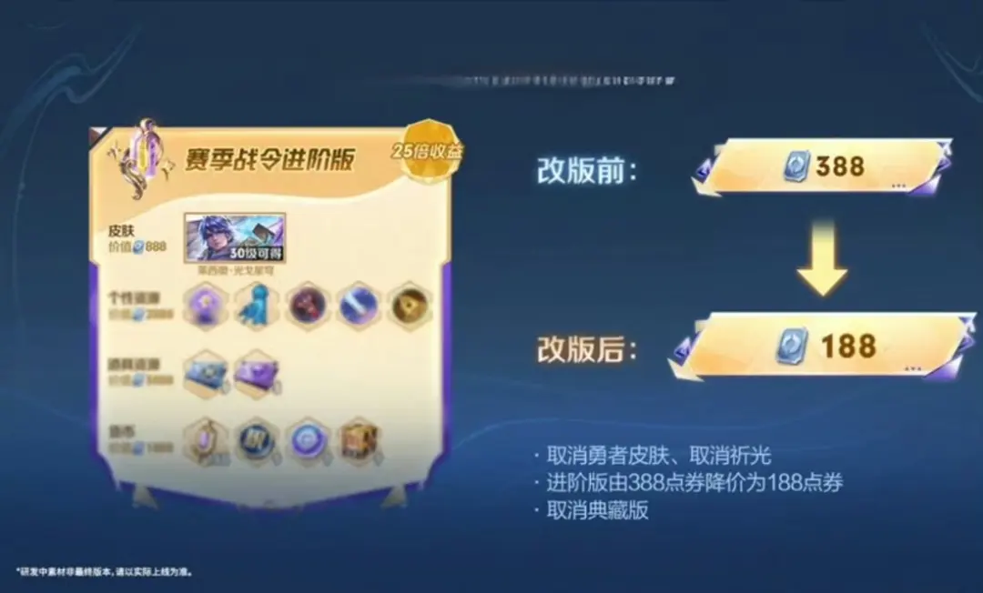 小王在当前表明了战令系统的又一波更新,就小王介绍,战令在新赛季将会进行改版,改版之后的战令进阶版直接降价了,从原有的388点券降价到188点券,并且直接取消了勇者战令皮肤,还有典藏战令以及祈光,同时,将赛季皮肤挪到了战令之中,不用进阶战令就可以获取,并且战令到达40级以后,还会将赛季皮肤升级成为史诗品质,不得不说,皮肤都可以升级了呢!战令进阶版的降价,虽说降的很多,毕竟388降到了188点券,但是更多的是取消了原有的福利,再者,赛季皮肤挪到战令之中,同时,赛季皮肤可以升级,也算是开创先河之作了。小伙伴们对全新战令系统如何看呢?